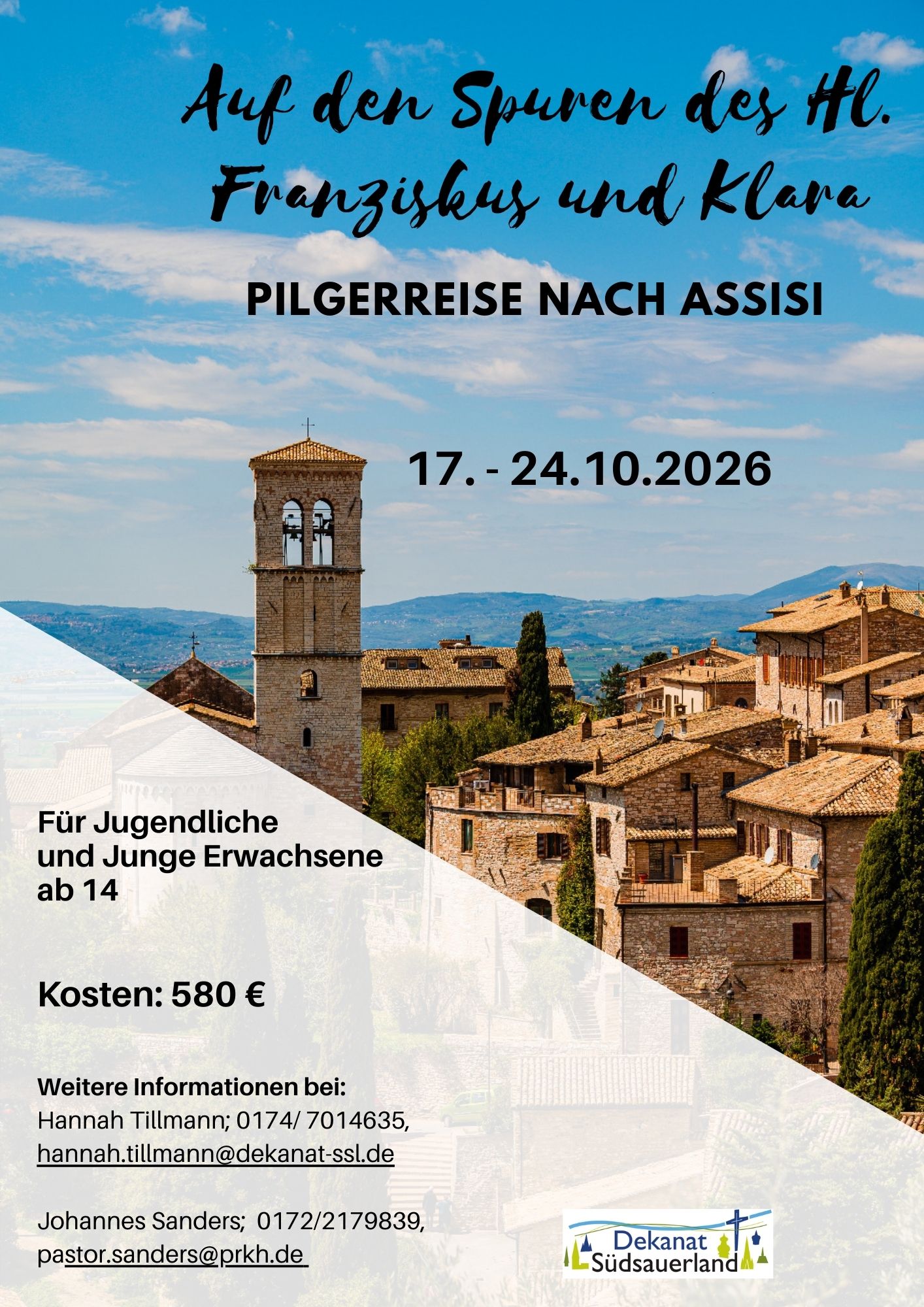 Vom 17. bis 24 Oktober 2026 findet die Pilgerreise nach Assisi statt und richtet sich an Jugendliche ab 14 Jahre und junge Erwachsene aus dem Dekanat.