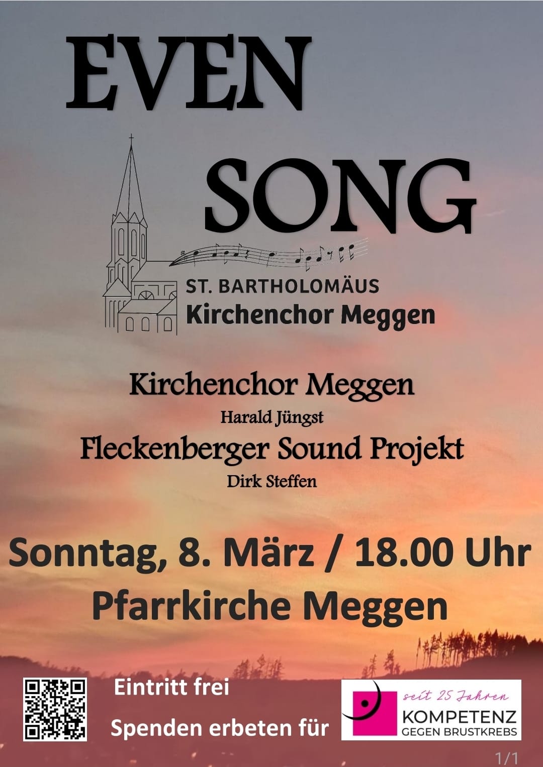 Pressemeldung. Zu einem besonderen musikalischen Abendlob „Evensong“ lädt der Kirchenchor St. Bartholomäus Meggen am Weltfrauentag, Sonntag, den 08. März, um 18 Uhr in die Meggener Pfarrkirche ein. Dieser gesungene Abendgottesdienst findet zugunsten des Vereins „Kompetenz gegen Brustkrebs e. V.“ statt. Der gemeinnützige Verein setzt sich seit 25 Jahren für die ganzheitliche Unterstützung von Frauen mit Brustkrebs ein – von Prävention über Therapie bis zur Nachsorge. Der Verein versteht sich als Teil eines engagierten Netzwerks und bietet Unterstützung von „Betroffenen für Betroffene“.